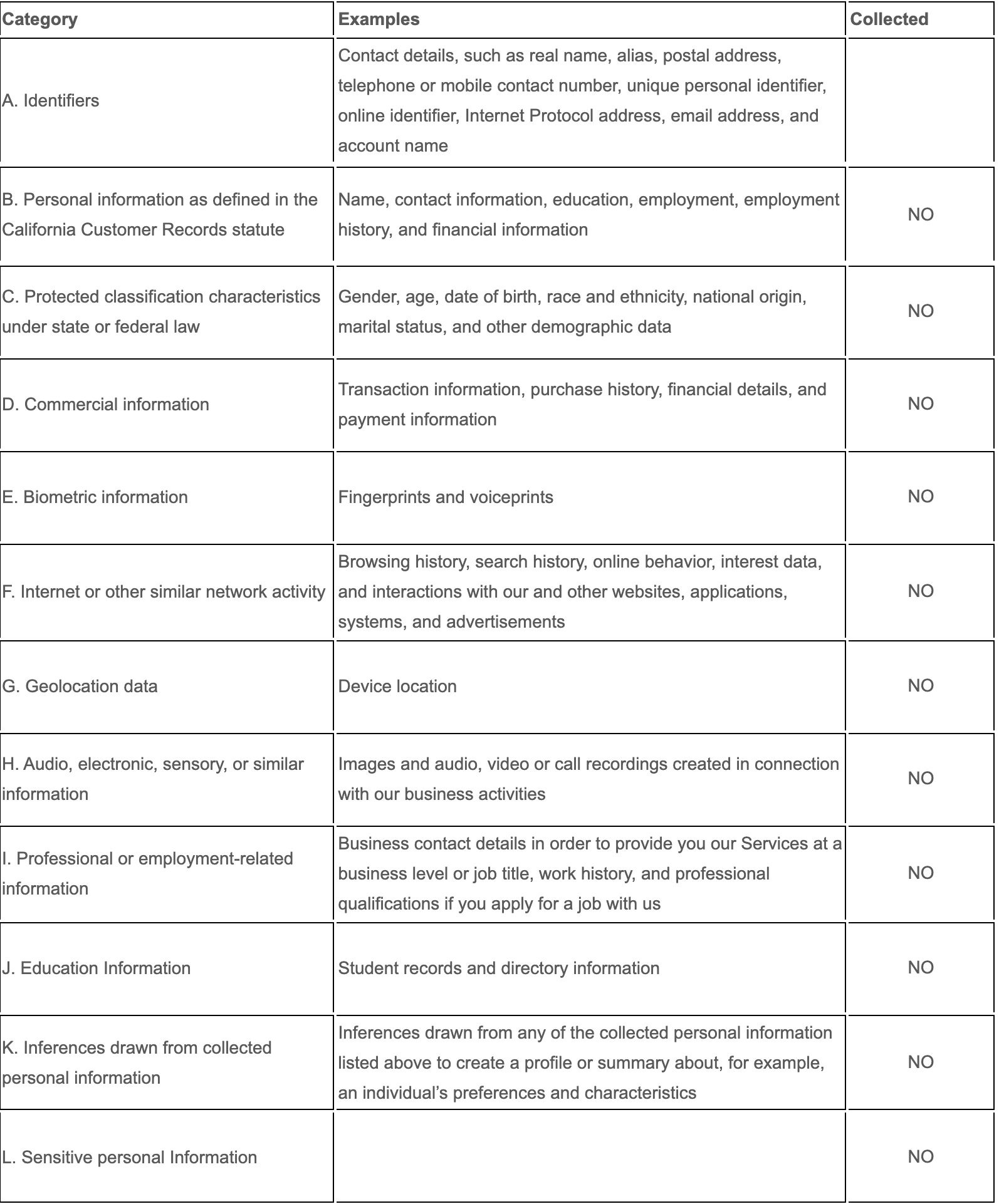 Categories of Personal Information We Collect